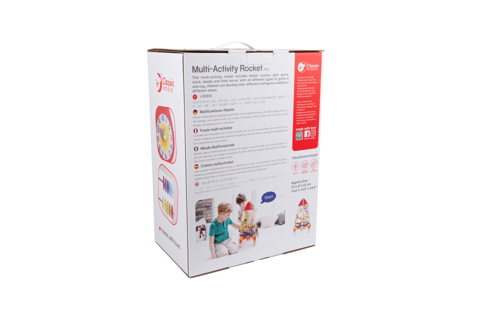 ¡Este cohete multi-interactivo es una fabulosa estación de aprendizaje educativo! Incluye: laberinto de cuentas, juego de engranajes, relojes y un espejito. Los niños se sentirán inspirados a usar su imaginación y desarrollar juegos de roles.