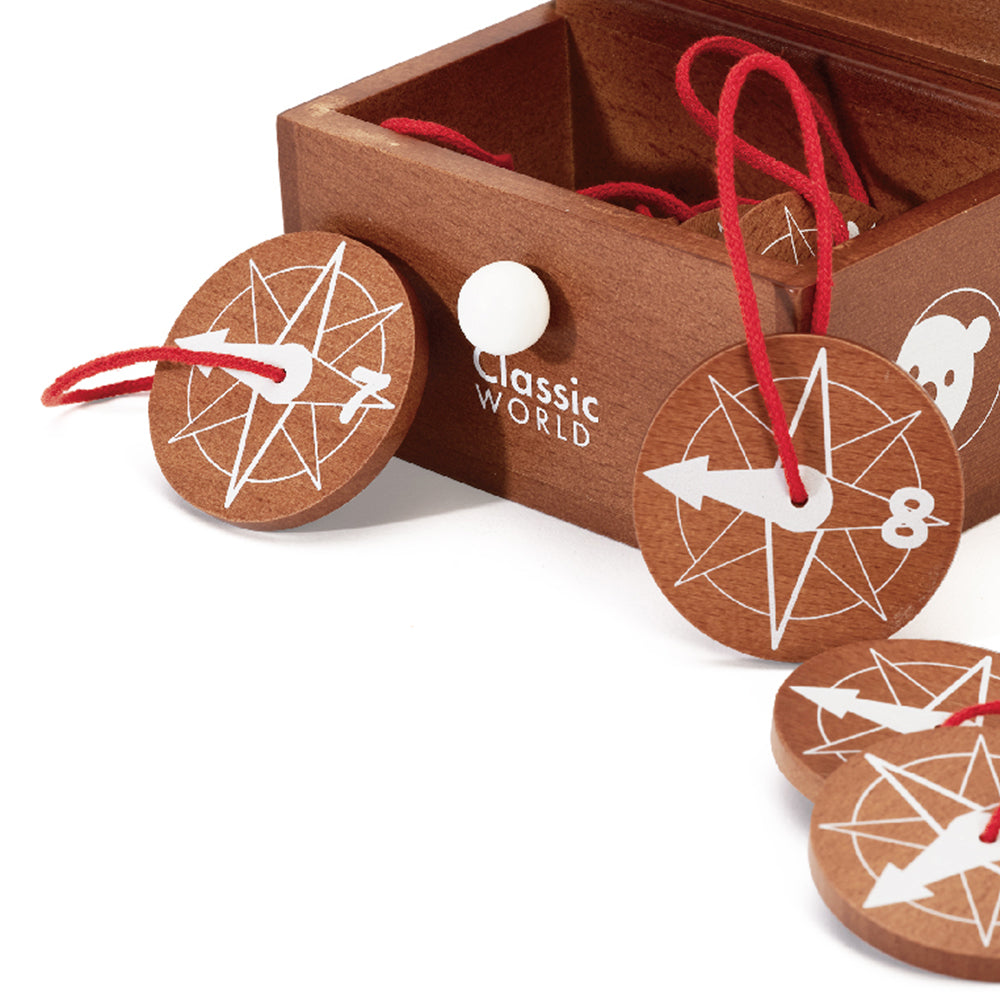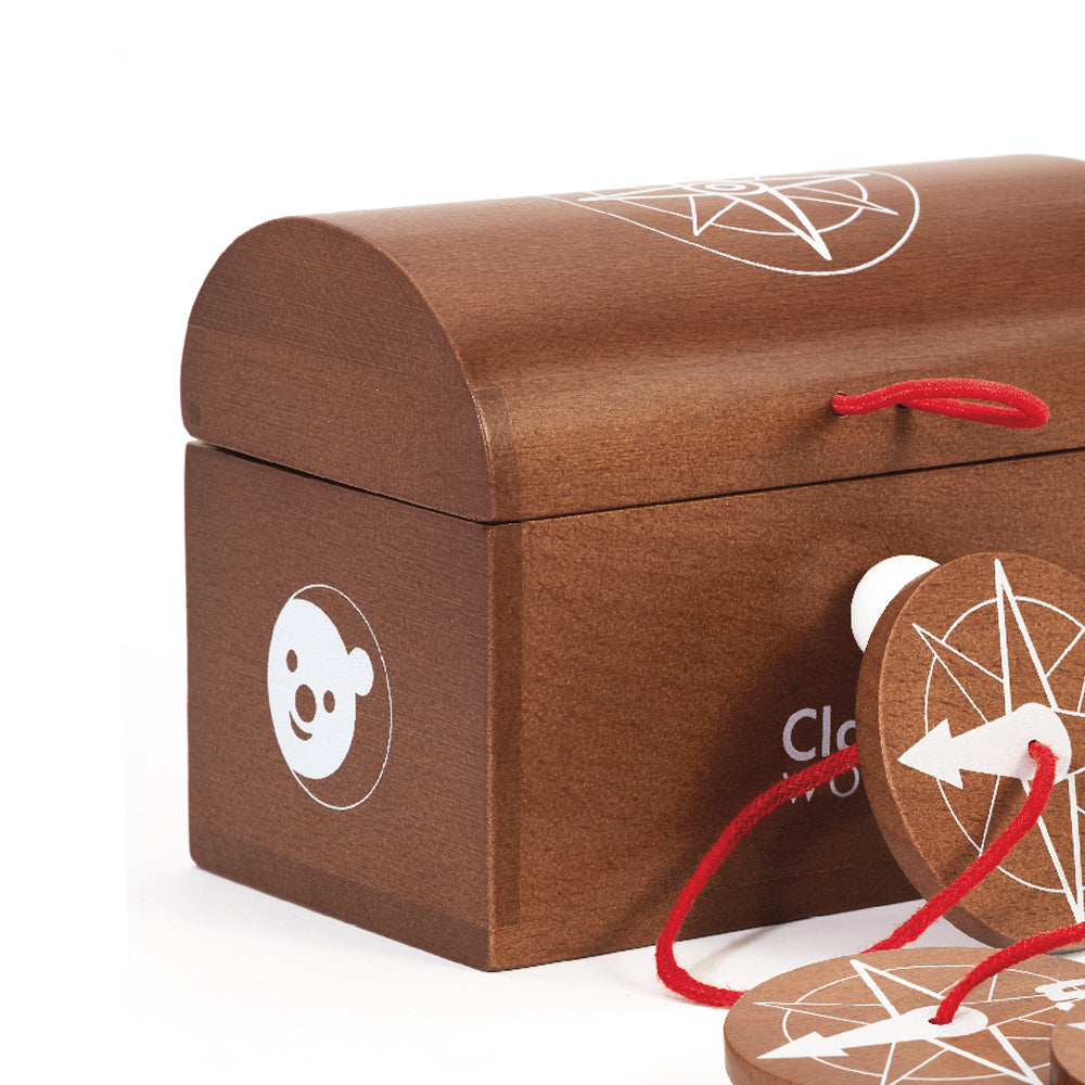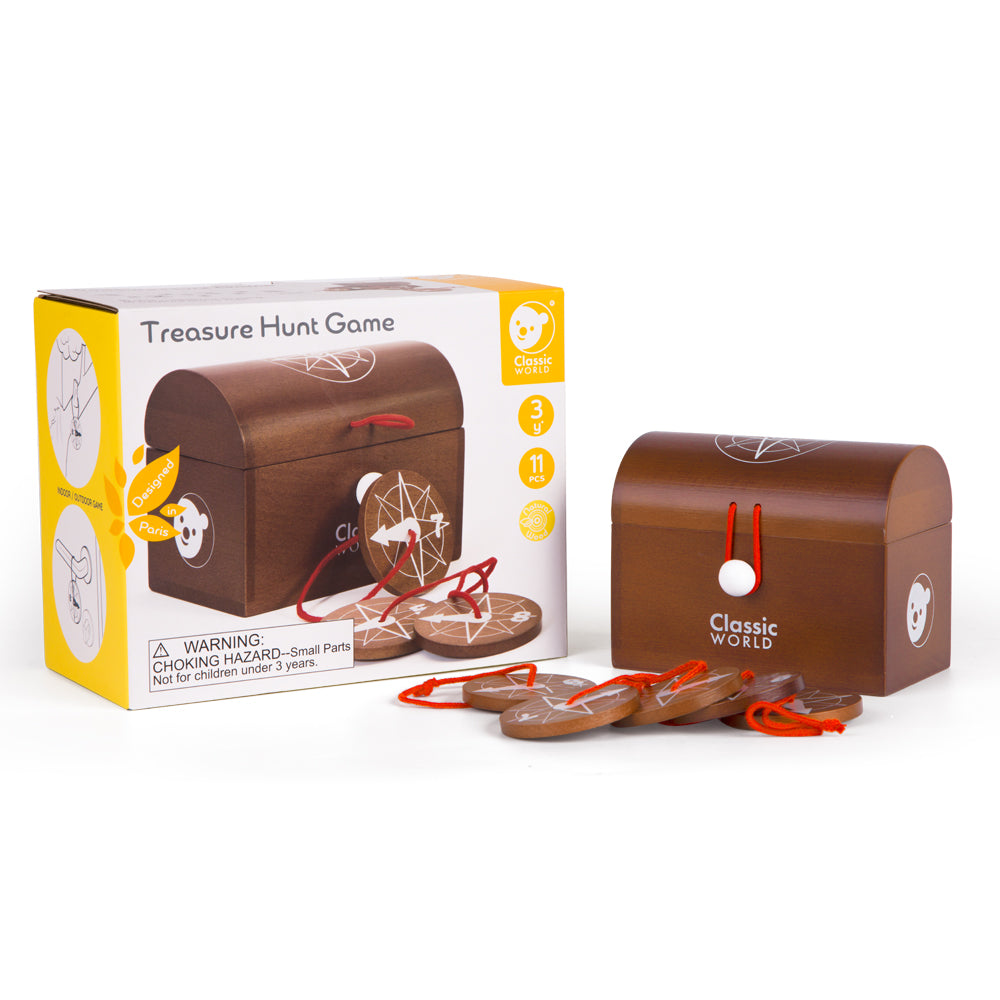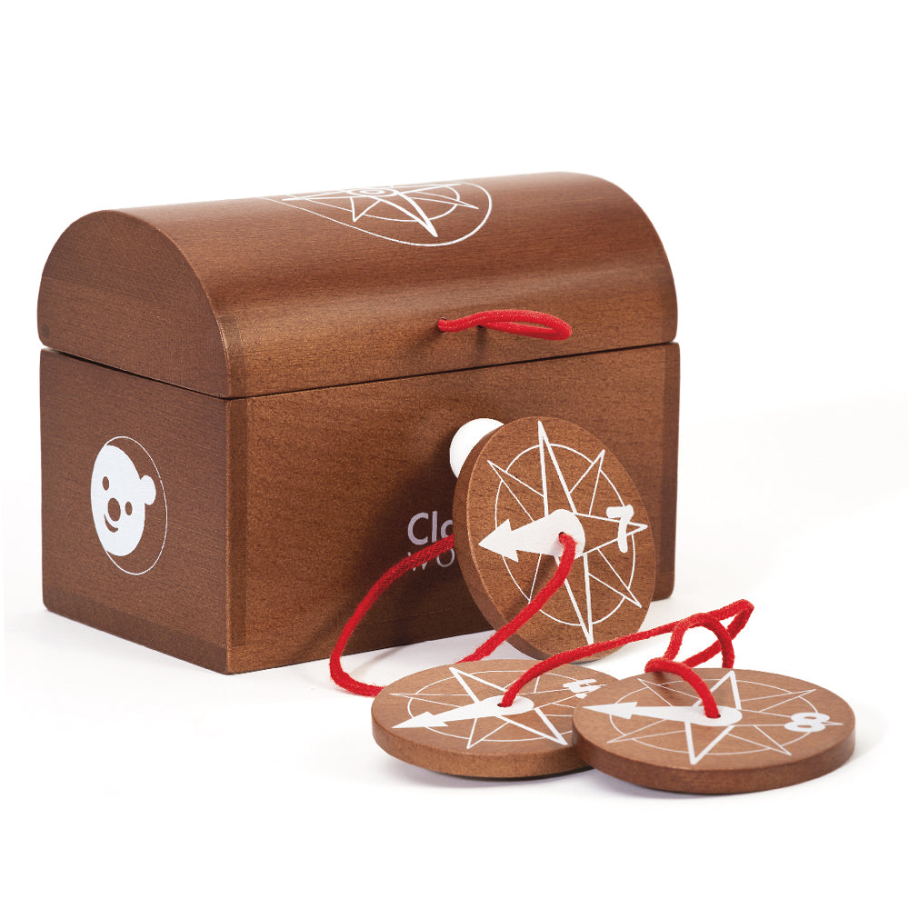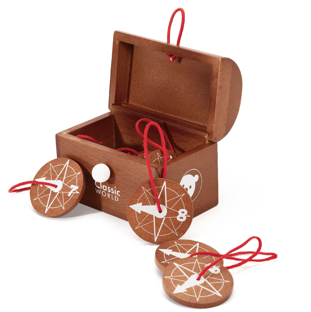 ¡Juguemos a la búsqueda del tesoro! ¡Puedes dar pistas sobre la dirección del tesoro escondiendo los medallones numerados del 1 al 10 en la casa o en el jardín! Puedes dejar una sorpresa de tu elección en el hermoso cofre de madera, dulces, un mensaje o un pequeño obsequio. Este juego muy divertido y emocionante se puede jugar con familia o amigos. ¿Dónde está el tesoro?