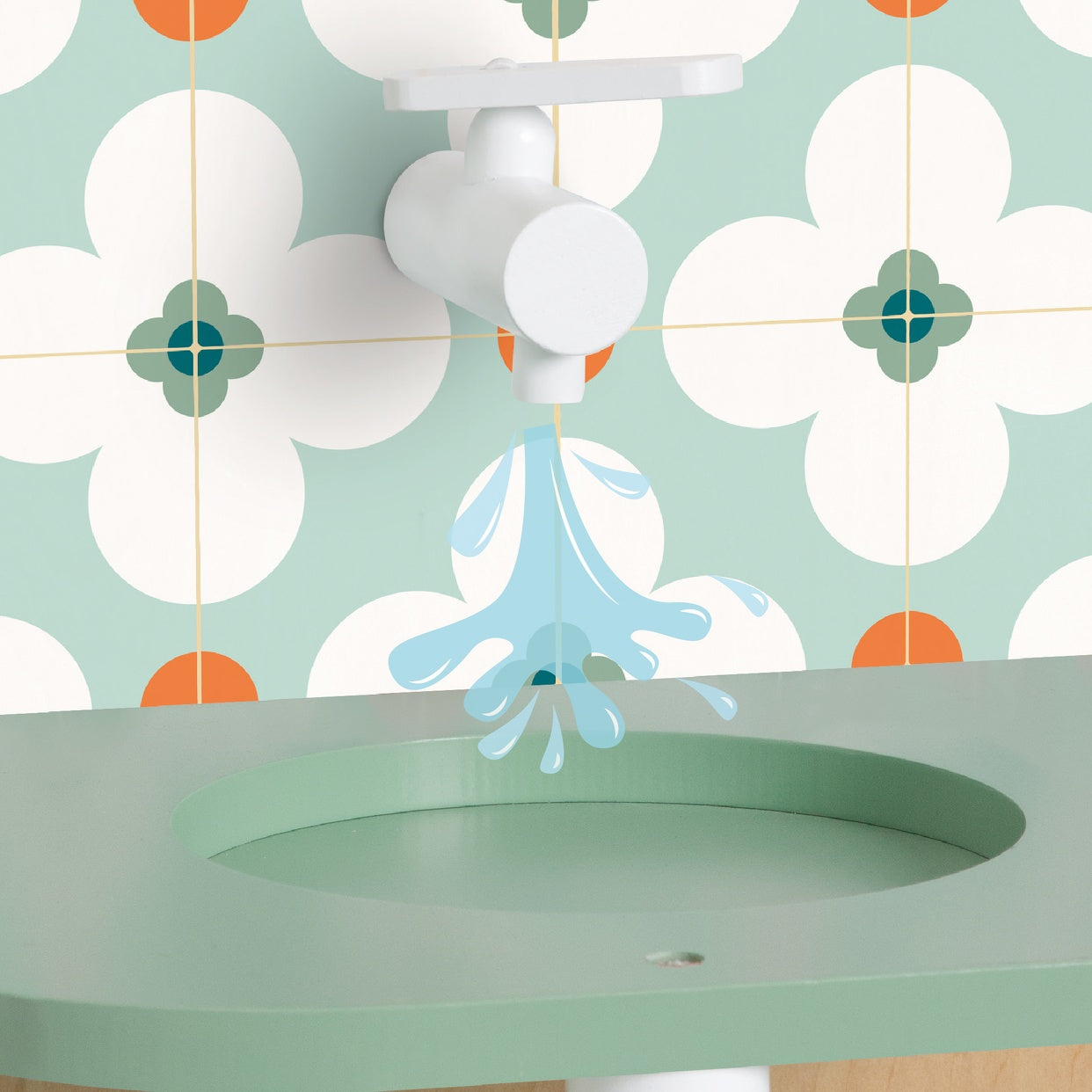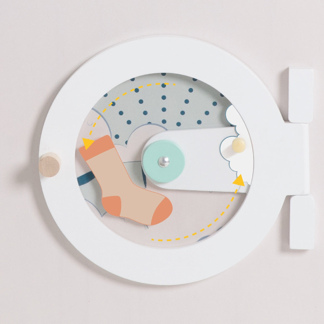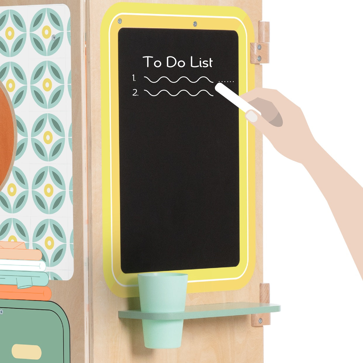Este es un rincón de juego multifuncional. Ofrece oportunidades de juego ilimitadas. Cuando los niños quieren jugar, usted despliega el sistema. Revela diferentes espacios de juego como la cocina (fregadero, hornillo, encimera, refrigerador y utensilios de cocina), también un cuarto de lavado con lavadora, una pizarra magnética, una ventana de servicio que también se puede usar como teatro de marionetas y más.