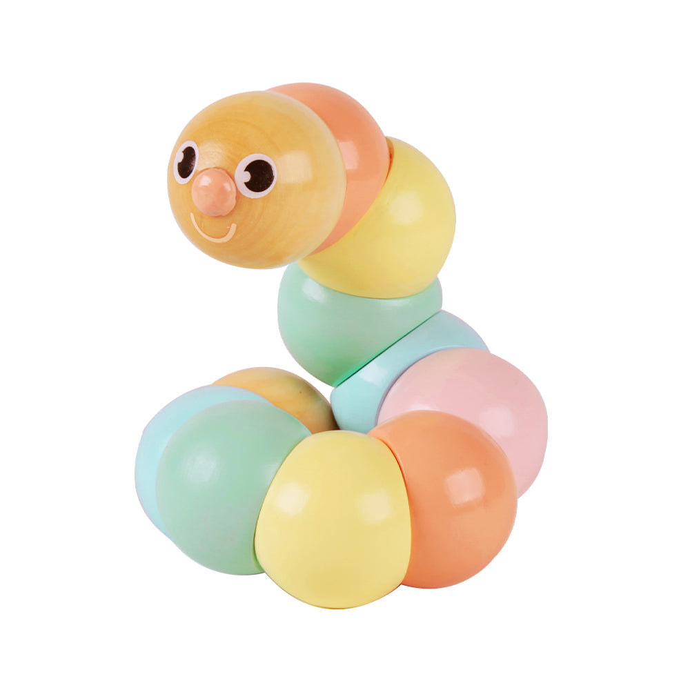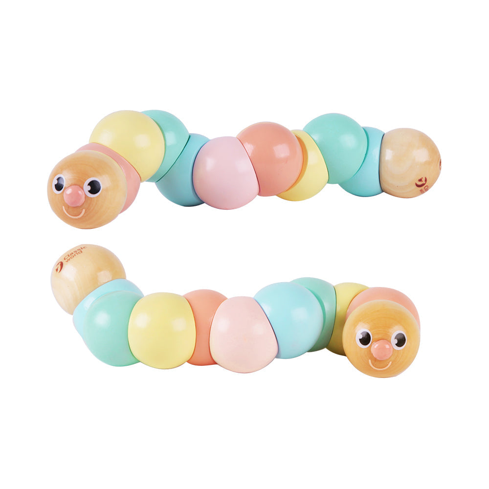 Esta adorable oruga tiene el tamaño justo para ser tomada por las manitas de los pequeños. Divertida de girar y doblar, hecha de cuentas de madera duraderas sobre una banda elástica gruesa. No tóxica.