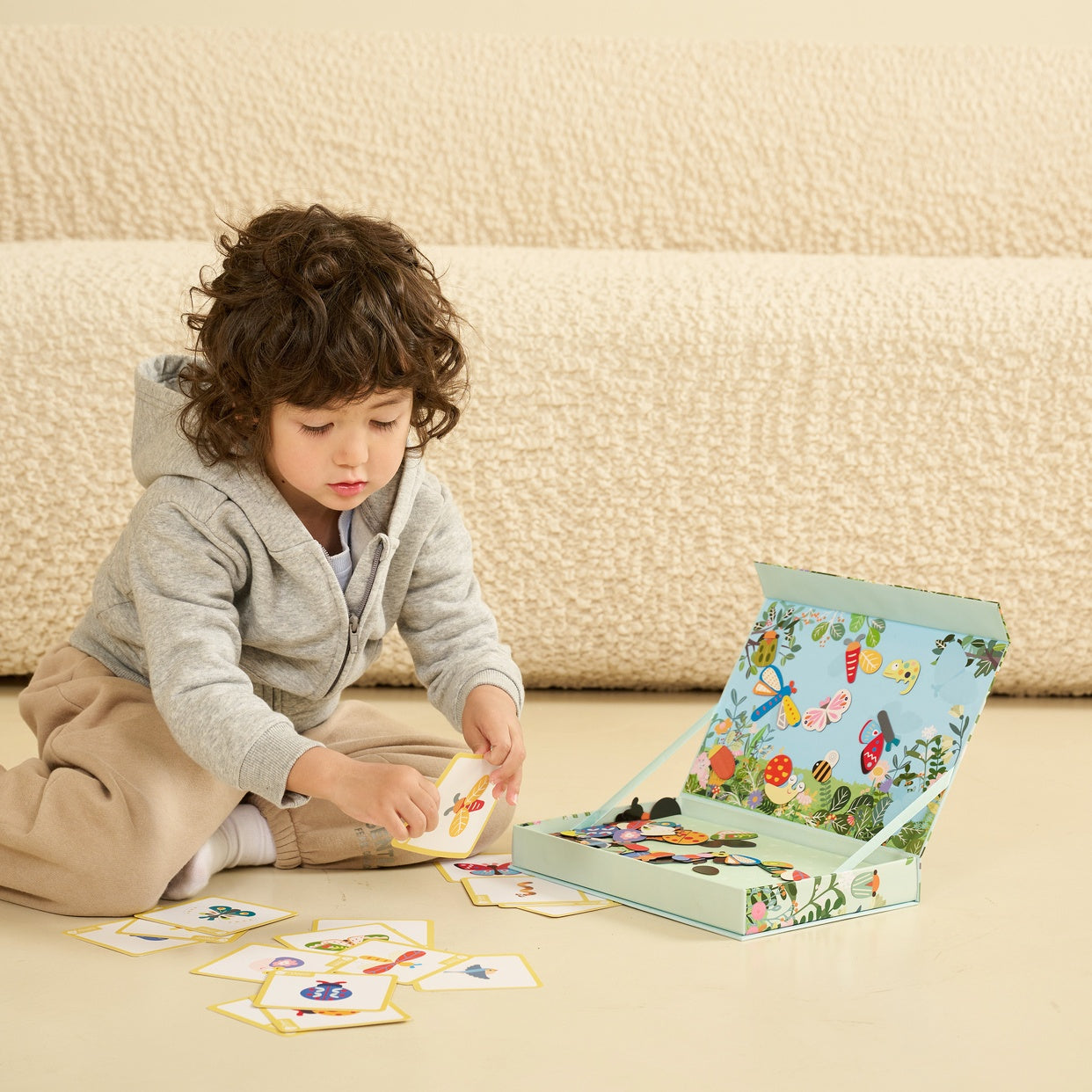 Este es un rompecabezas de imágenes magnéticas con temática de insectos. Incluye una variedad de piezas coloridas para crear hermosas mariposas, libélulas y escarabajos.
