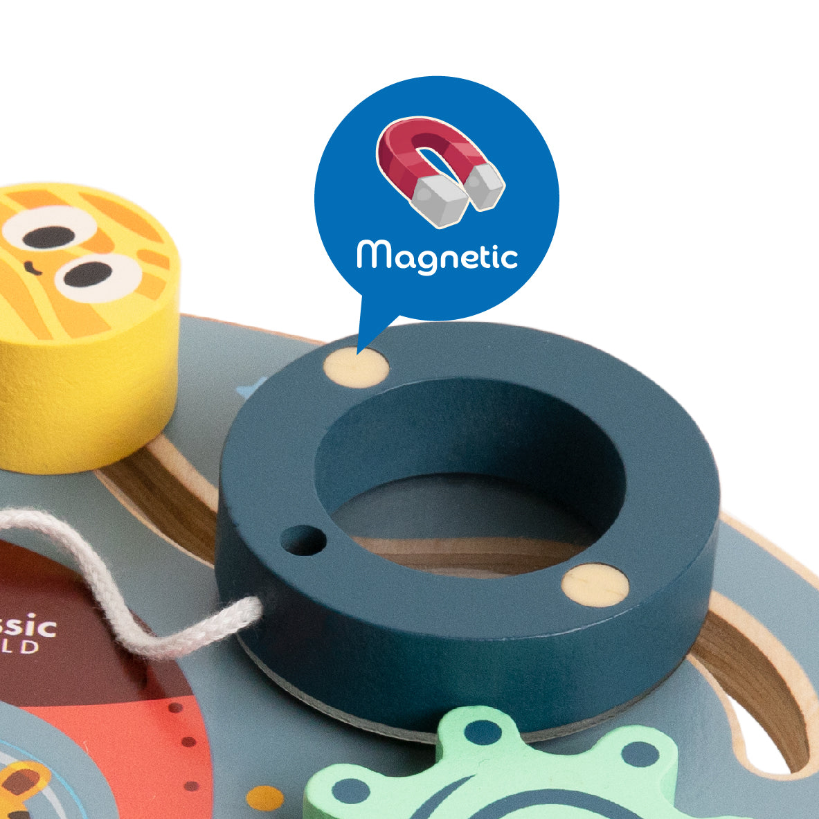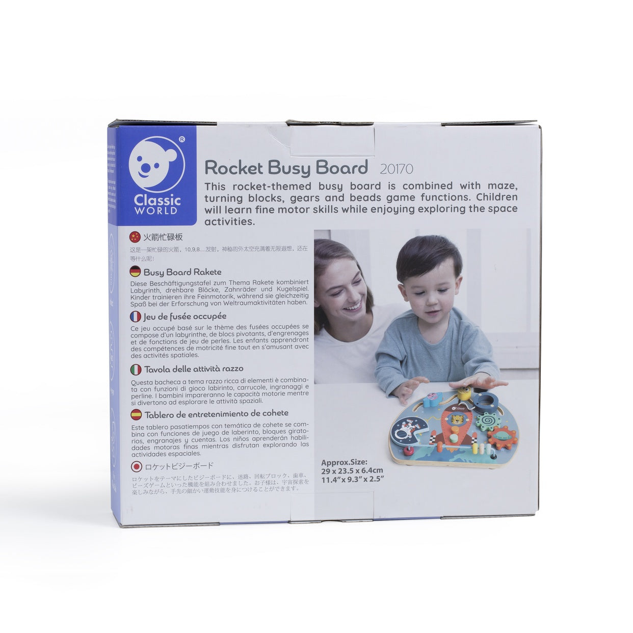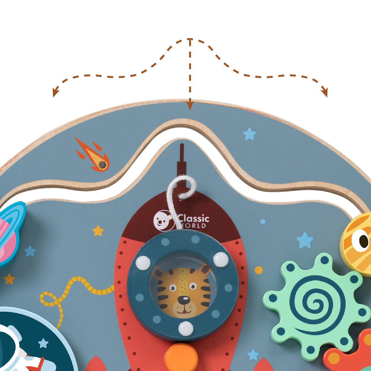 Este tablero para mantener a los niños ocupados con temática de cohete combina funciones de juego de laberinto, bloques giratorios, engranajes y cuentas. Los niños aprenderán habilidades motoras finas mientras disfrutan explorando las actividades espaciales.