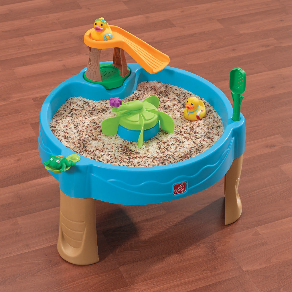 ¡Quack, quack! Es hora de salpicar por doquier con la Duck Pound Water Table de Step2. El juego con agua no sólo fascina sus imaginaciones, sino que también fomenta las habilidades sensoriales cuando los pequeños presionan los patos y rana de plástico al tiempo que salpican dentro del agua. Los niños pequeños pueden tomar turnos usando el molino de agua para aumentar la emoción. ¡Los preescolares se divertirán como nunca con este juguete para exteriores con tema de estanque. Hecho en EUA de partes de EEUU e importadas. Accesorios hechos en China.