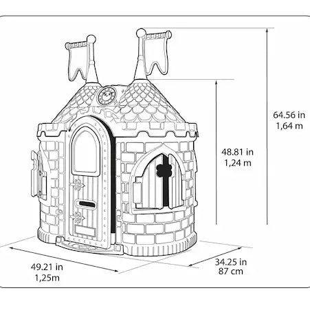 ¡Casa de juegos decorada como un castillo medieval para crear muchas historias! Dos torres, una puerta grande y cuatro ventanas, con una bandeja y pomo electrónico con diferentes sonidos. Resistente a la luz solar y a los cambios de temperatura, resistente y fácil de ensamblar. Edad: a partir de 2 años. Dimensiones del producto ensamblado: 125 (L) x 87 (W) x 164 cm (H).