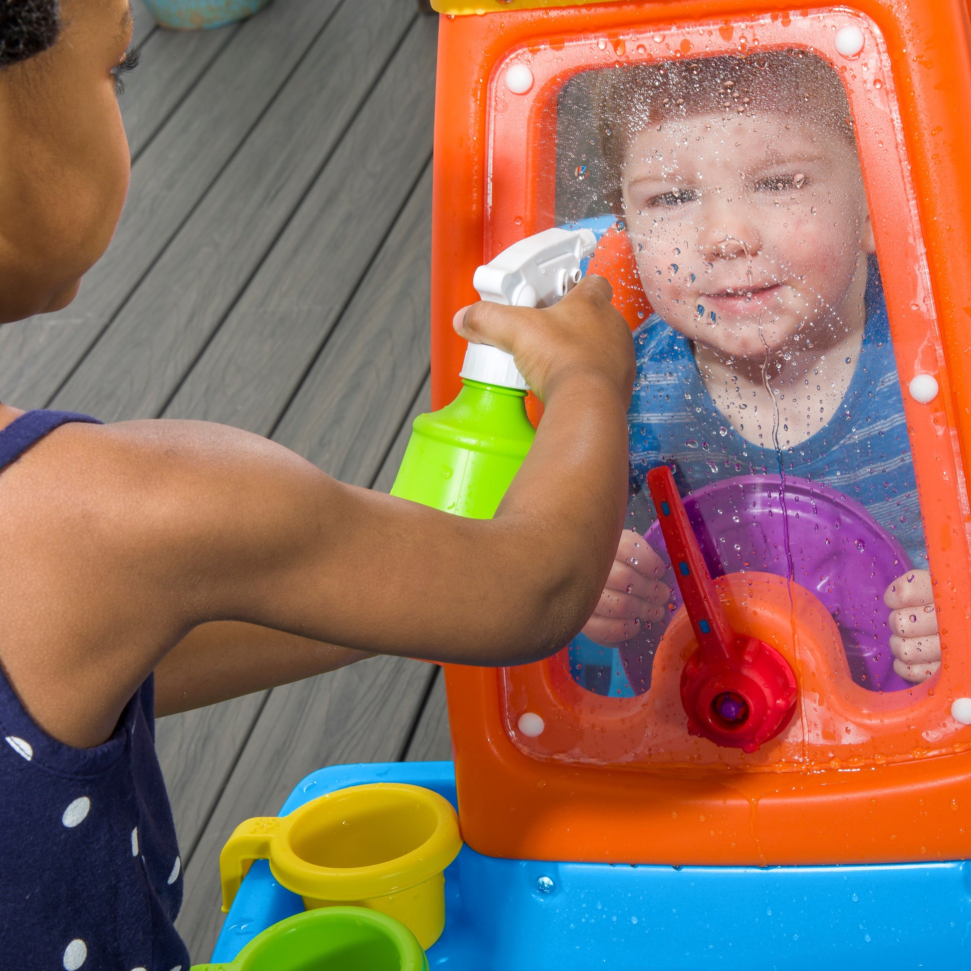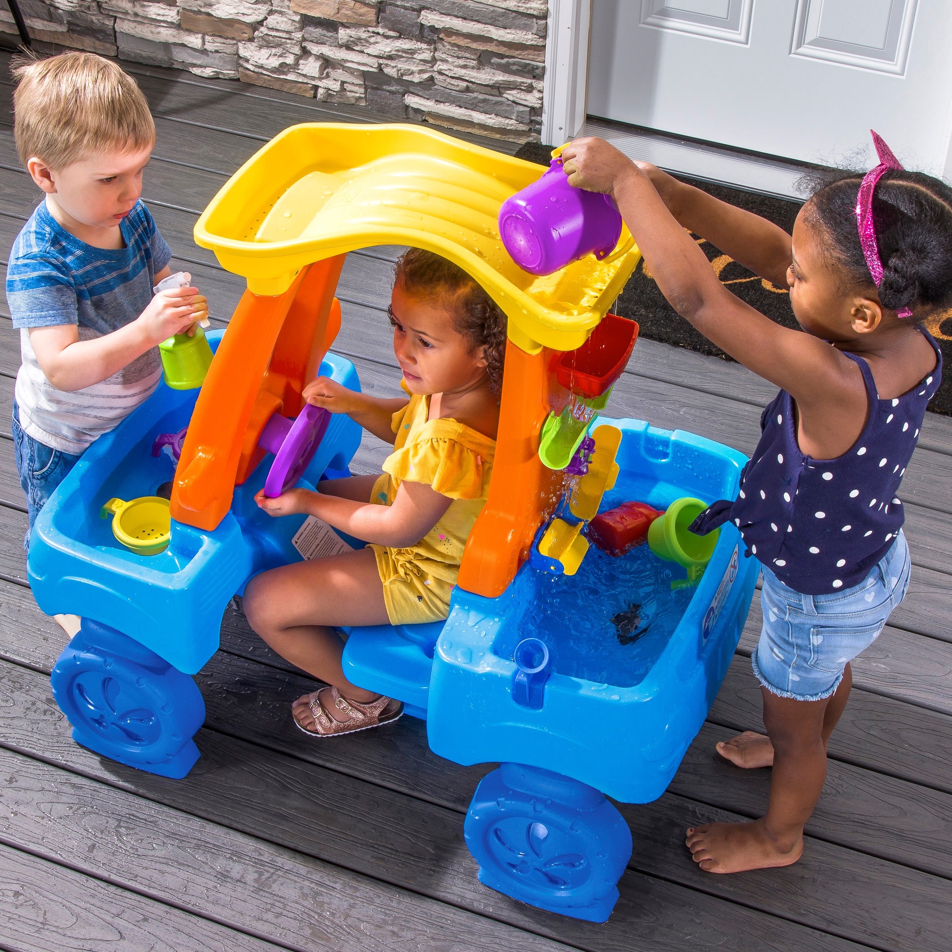 - Los niños escucharán el trago del agua en el "tanque de gasolina", el chirrido del limpiaparabrisas y la lluvia a medida que el agua se derrama por el laberinto, agregando una amplia exploración sensorial a la experiencia de juego del centro de actividades acuáticas.