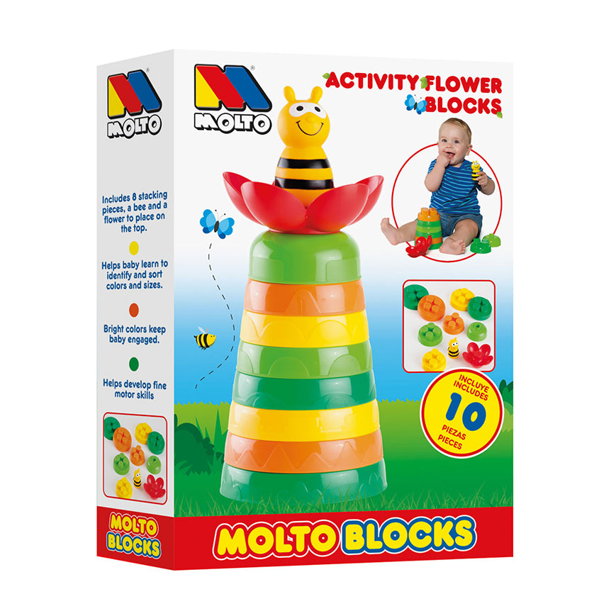 Flor de bloques con 10 piezas para montar una flor de muchos colores y una divertida abejita de juguete que corona la flor.