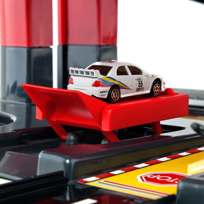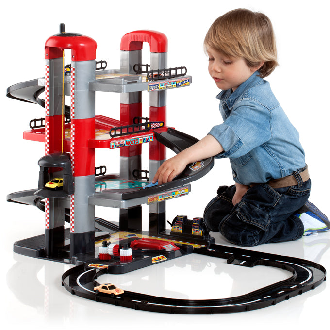 Fabuloso garaje nuevo con mucha diversión y horas de juego. base firme y construcción estable, pero muy fácil de montar. contenido: elevador de autos, lavado de autos, rampa de inspección, bombas de gasolina y muchos otros accesorios. no se requieren pilas.