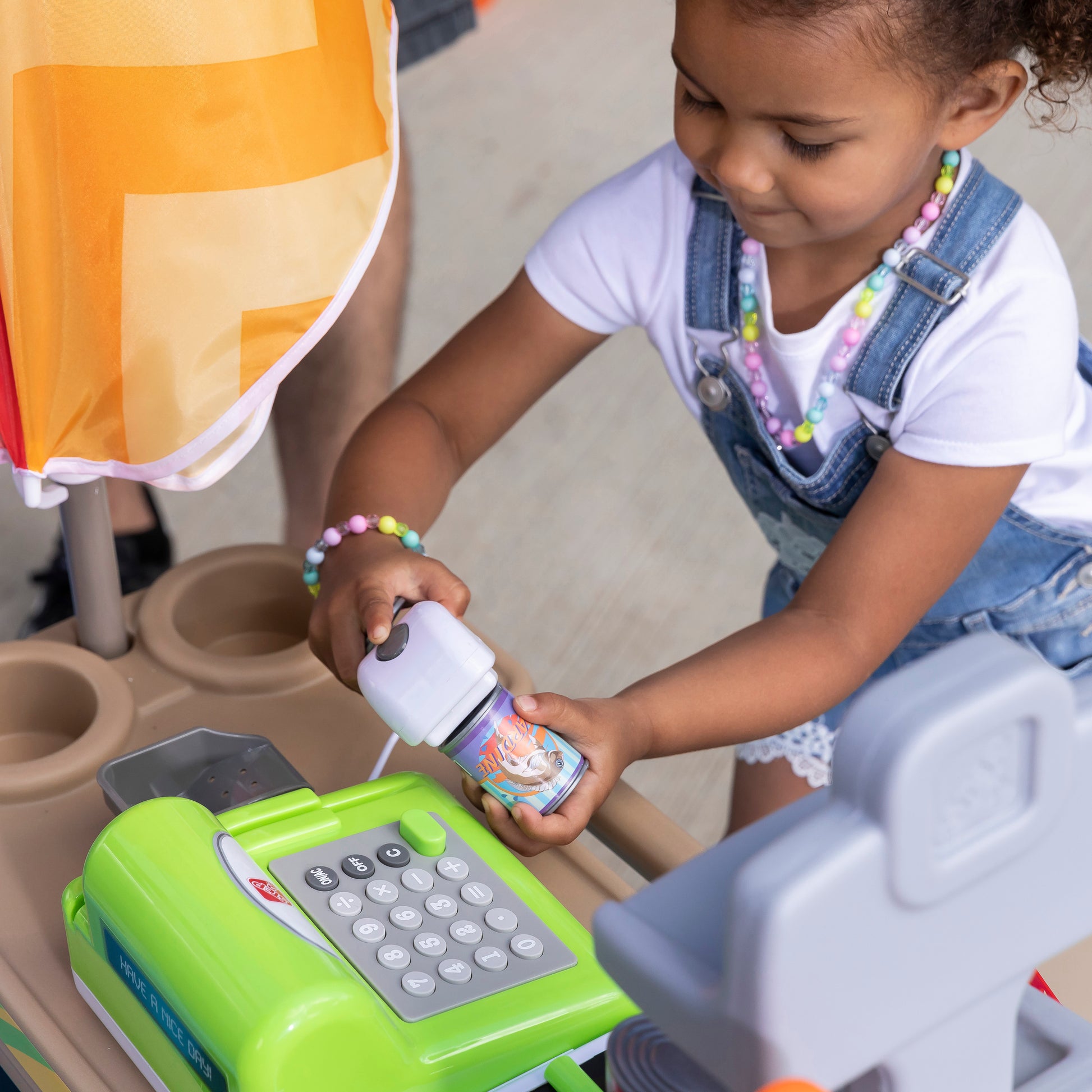 Pequeños emprendedores, prepárense; ¡predecimos mucha diversión y aprendizaje! ¡El Mercado Stop & Go de Step2 lo tiene todo! Este mercado de juguete viene con una bomba de gasolina, una cabina de peaje, conos, una pizarra y una caja registradora que funciona. Los niños pueden turnarse para jugar como cajero y cliente. Los pequeños pueden llegar al mercado en sus bicicletas o autos de juguete para llenar el tanque de gasolina y pagar el peaje. Incluso pueden usar la pizarra para escribir las ofertas diarias, los precios de la gasolina o el nombre de su mercado. Este mercado de juguete tiene una sombrilla para mantener a los niños protegidos y frescos del sol, y también tiene ruedas, para que puedan moverlo fácilmente a su próxima ubicación.