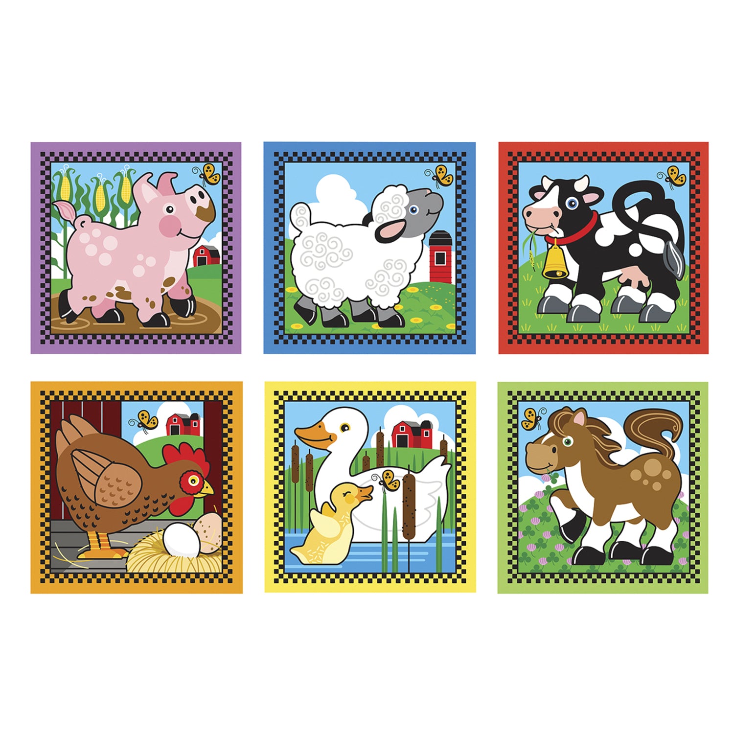 ¡Seis rompecabezas en uno! Hay dieciséis cubos sólidos de madera en este rompecabezas único. Una parte de un animal de granja de colores se representa en cada lado. Para completar los seis animales diferentes debemos rotar los cubos en la bandeja de madera incluida.