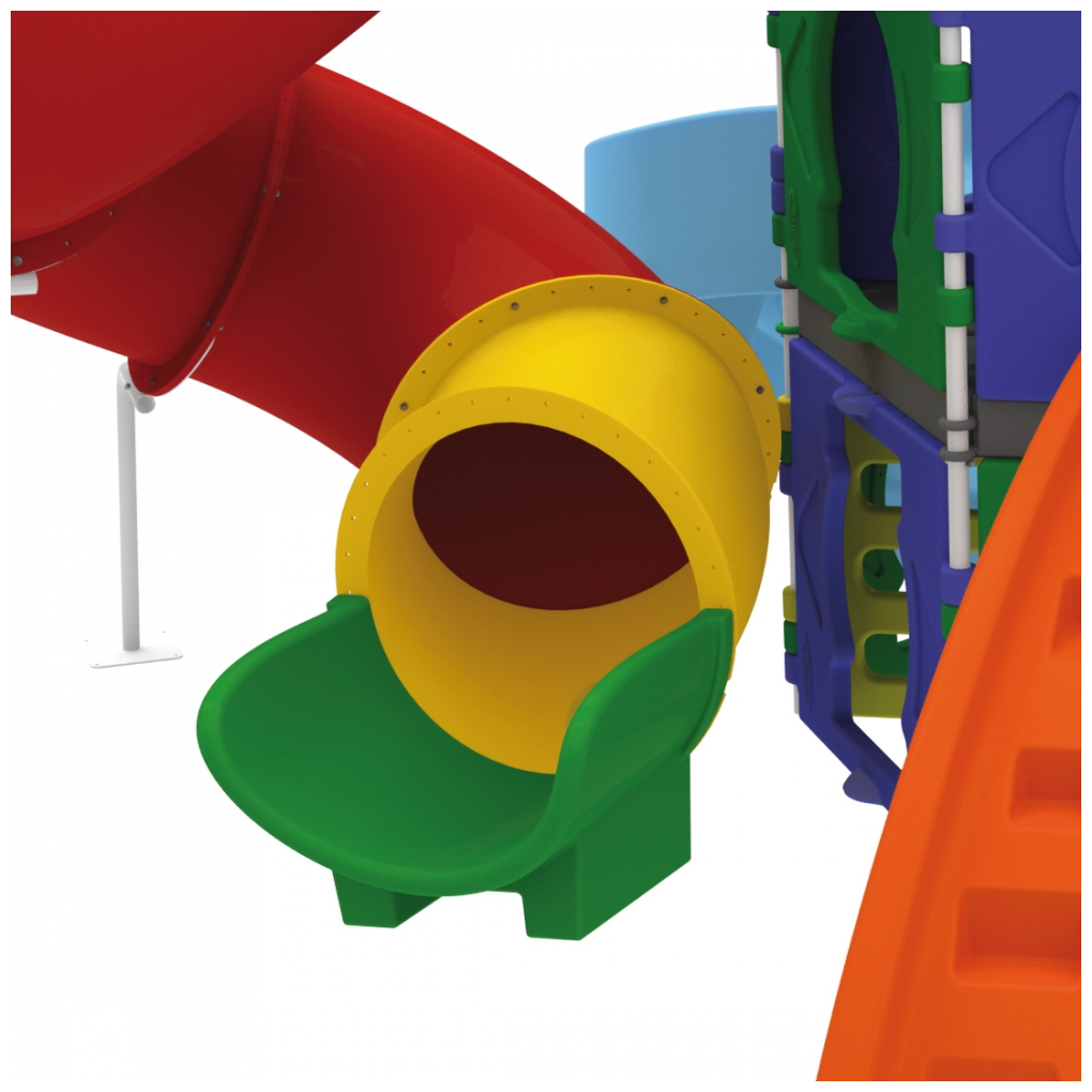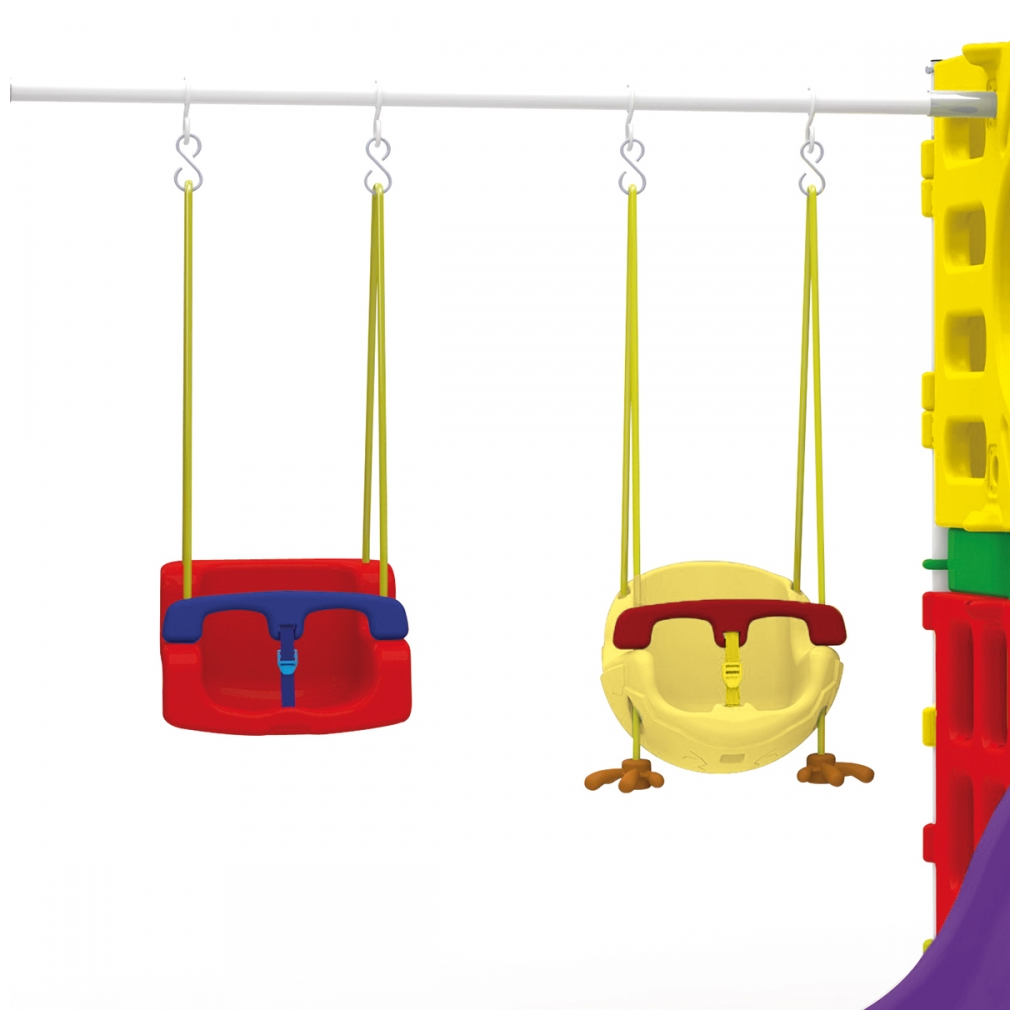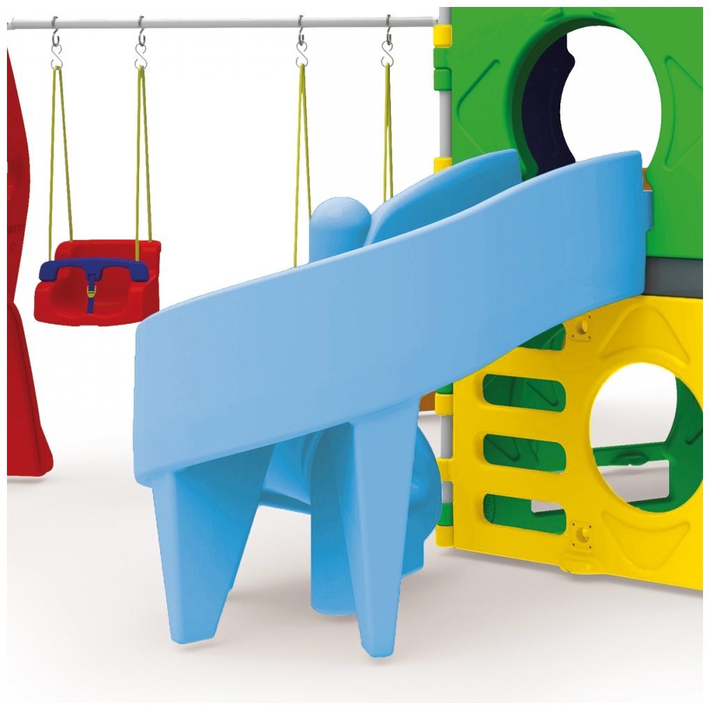 Playground con dos escaladores, tablero de basquetlbol con pelota, dos columpios, dos túneles, resbaladilla ondulada, tobogán abierto y uno cerrado.